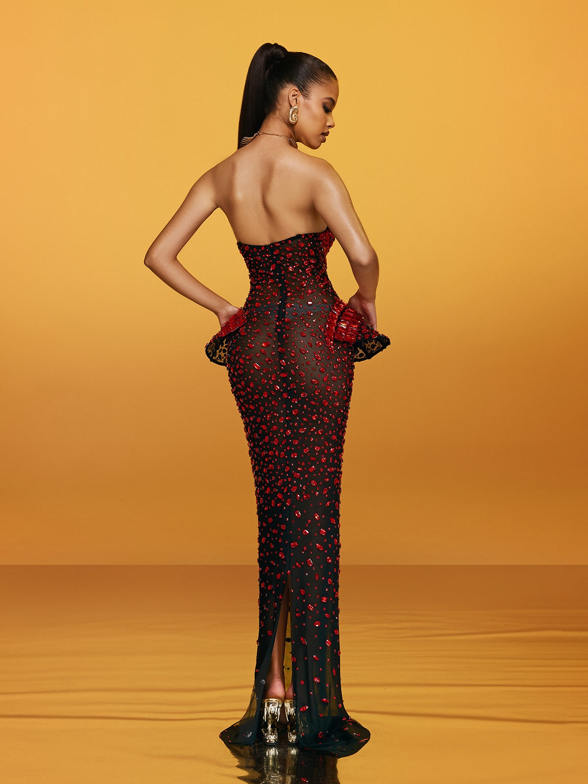 Elevate your evening look with the Arygon Strapless Cutout Crystal Maxi Dress. This stunning gown features a sleek strapless design and elegant cutouts that highlight your silhouette, while sparkling crystal accents add a touch of glamour. Perfect for special occasions, it combines sophistication with a modern edge to ensure you stand out effortlessly.