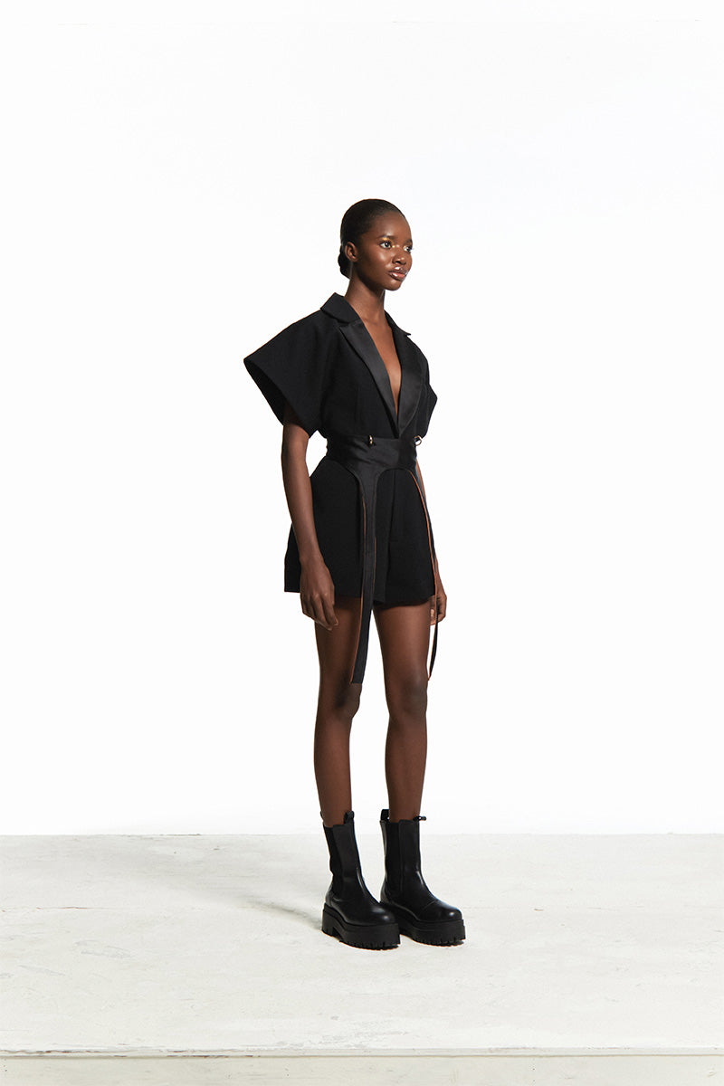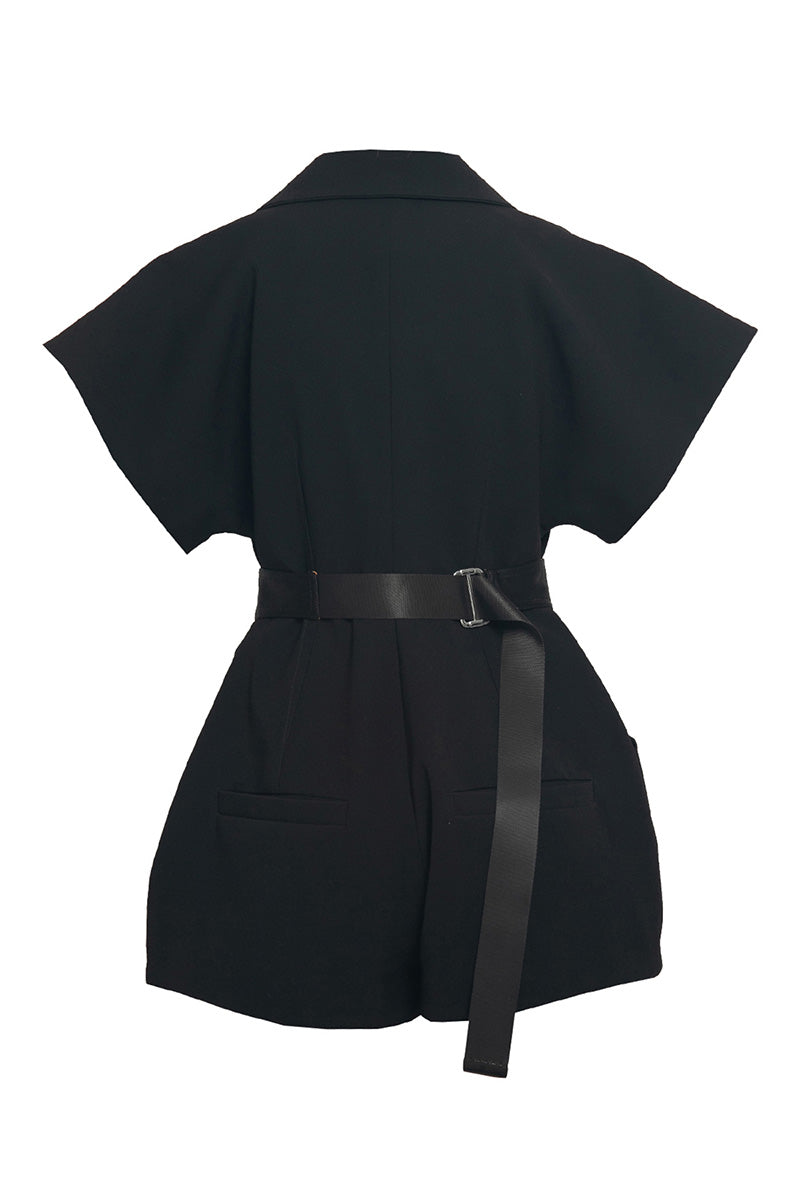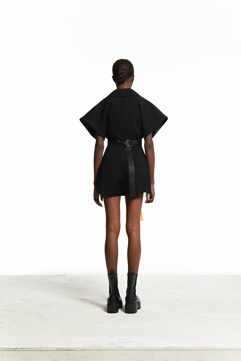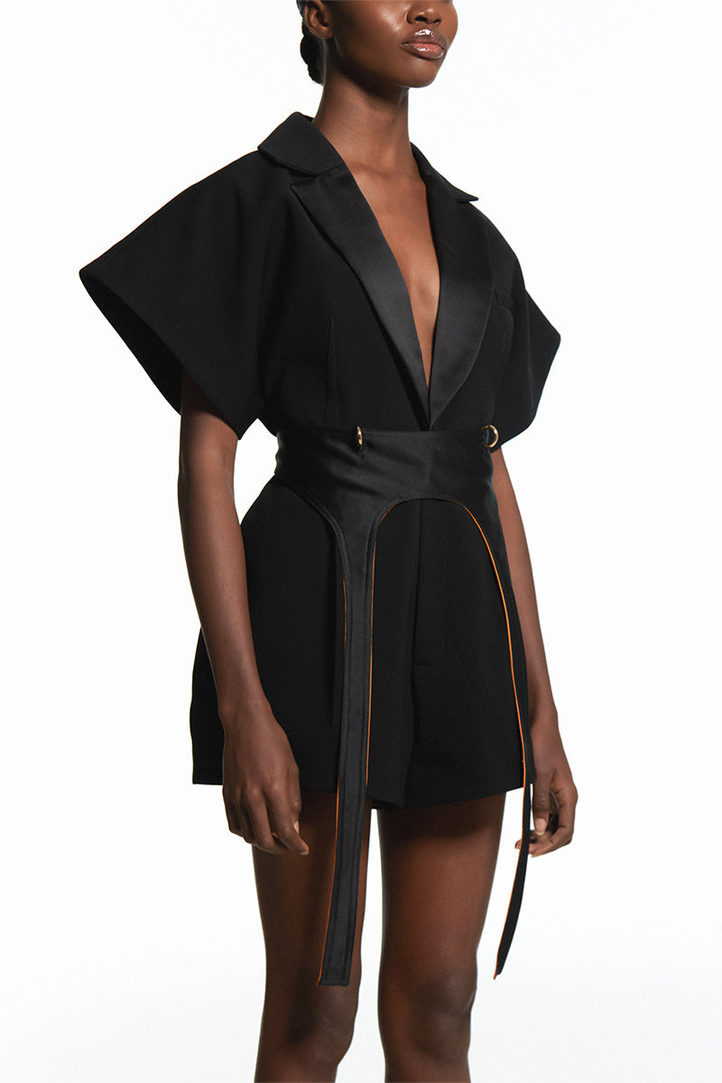 Black tailored jumpsuit with kimono sleeve and with pierced belt.