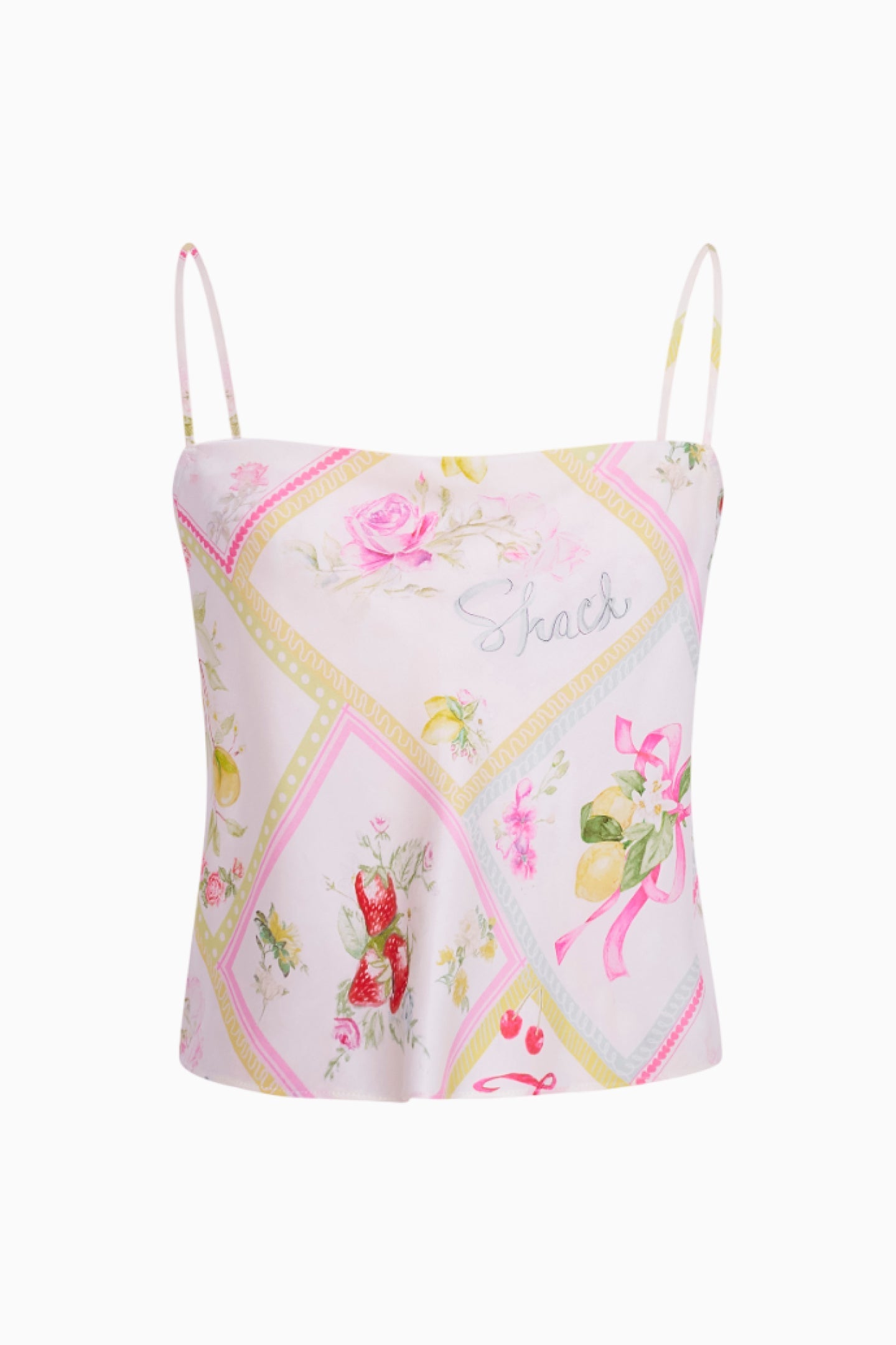 Feeling chic in the Cabi Top. Arriving in a silk blend charmeuse fabric, this pretty top features a beautiful hand-painted print of cherries, lemons, and florals amongst diagonal strips, inspired by postcards from Italy. The bias cut cami top is flirty and feminine with thin spaghetti straps and a flattering silhouette.
