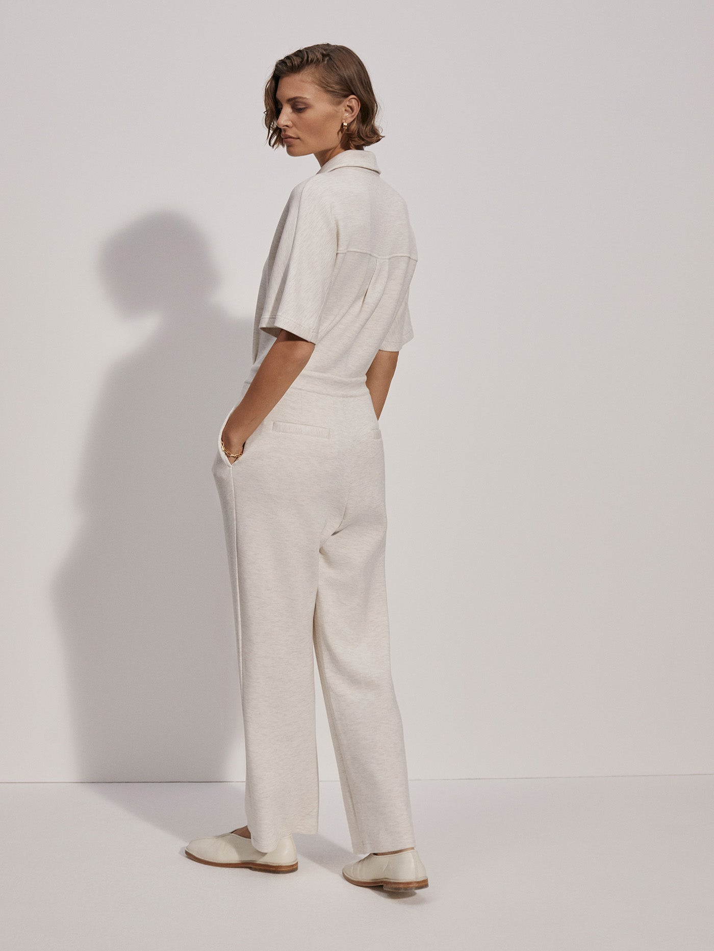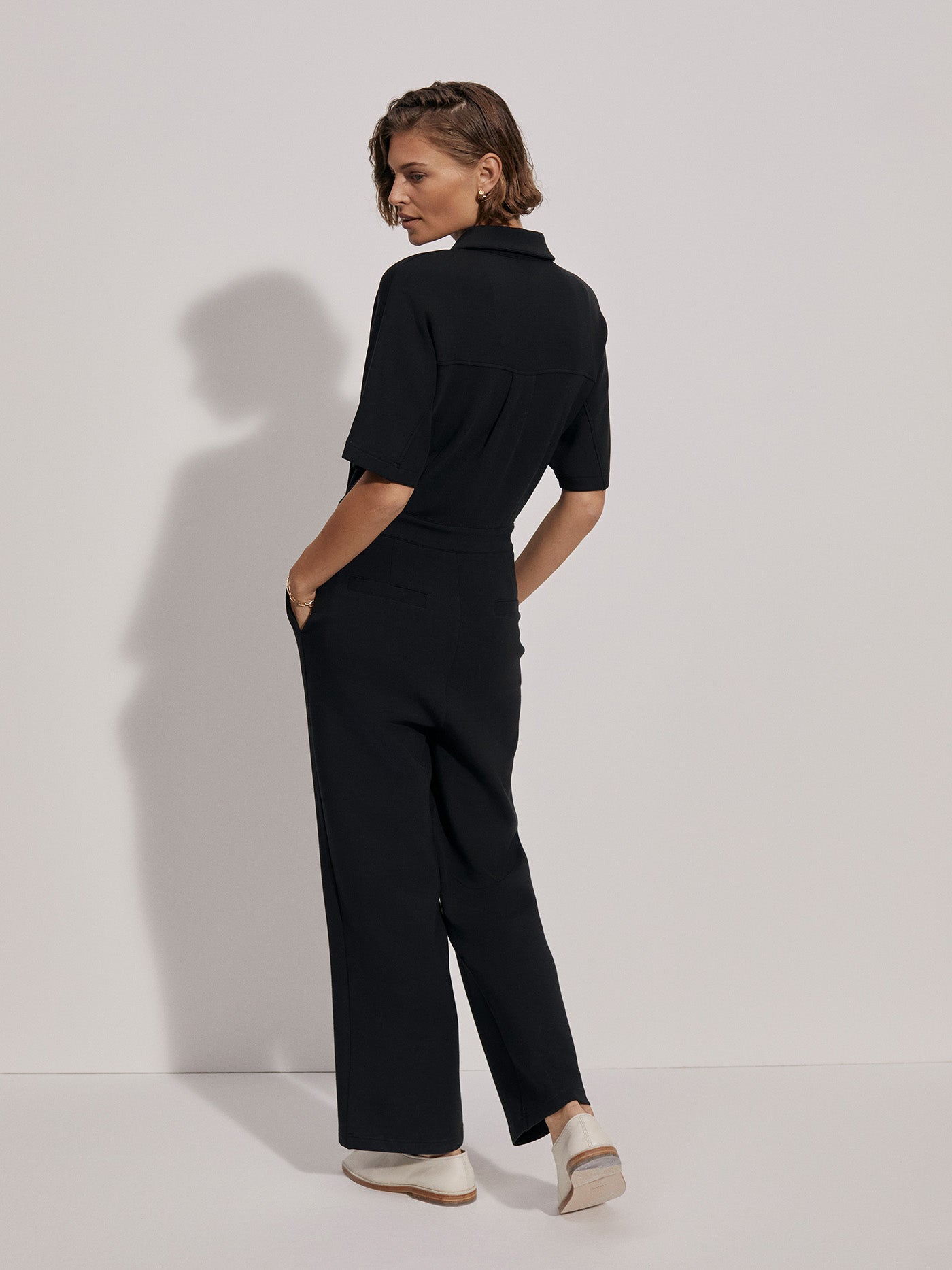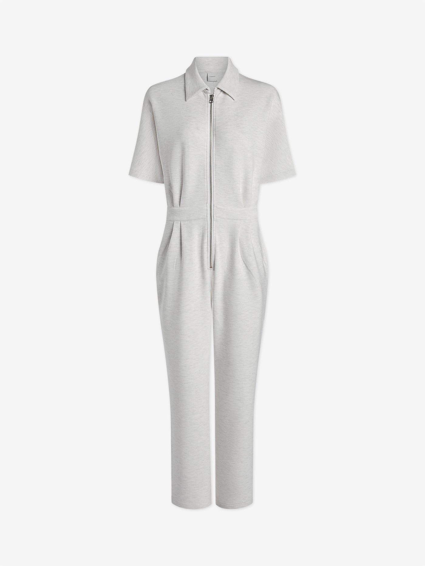 With its short sleeves, zip front, and tailored straight leg, this DoubleSoft™ piece offers a relaxed yet refined silhouette. Featuring pleats at the waist and a timeless collared neckline, it effortlessly transitions from casual days at home to evenings out.