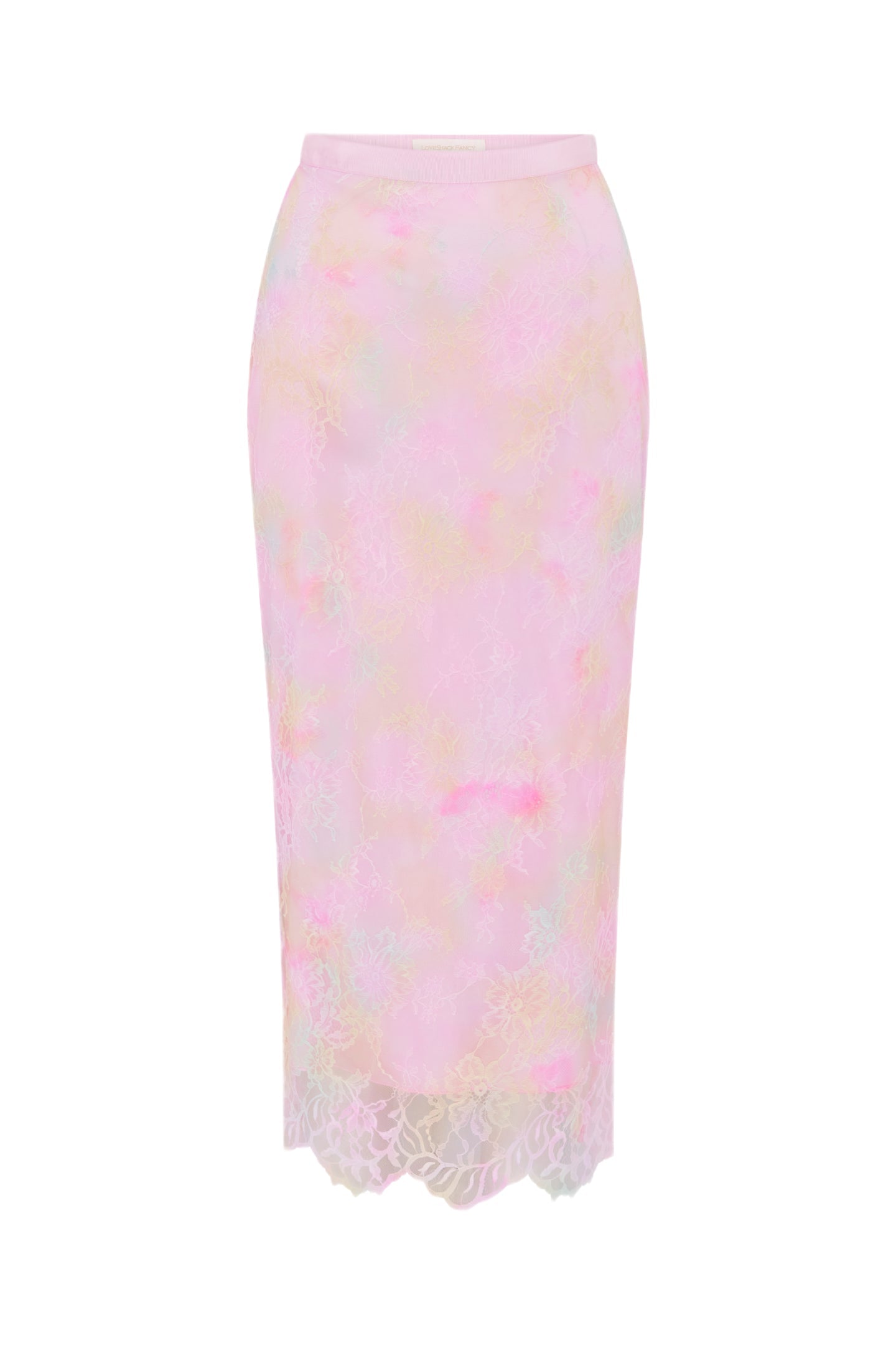Introducing the Goodall Skirt. The piece debuts with a tie-dye printed, delicate chantilly lace cotton fabric. This midi skirt features a pencil-like silhouette, scallop detail at the hem, and a center back slit. The piece comes fully lined and includes a side seam zipper for functionality. Pair with the Ferni Top for a full set.