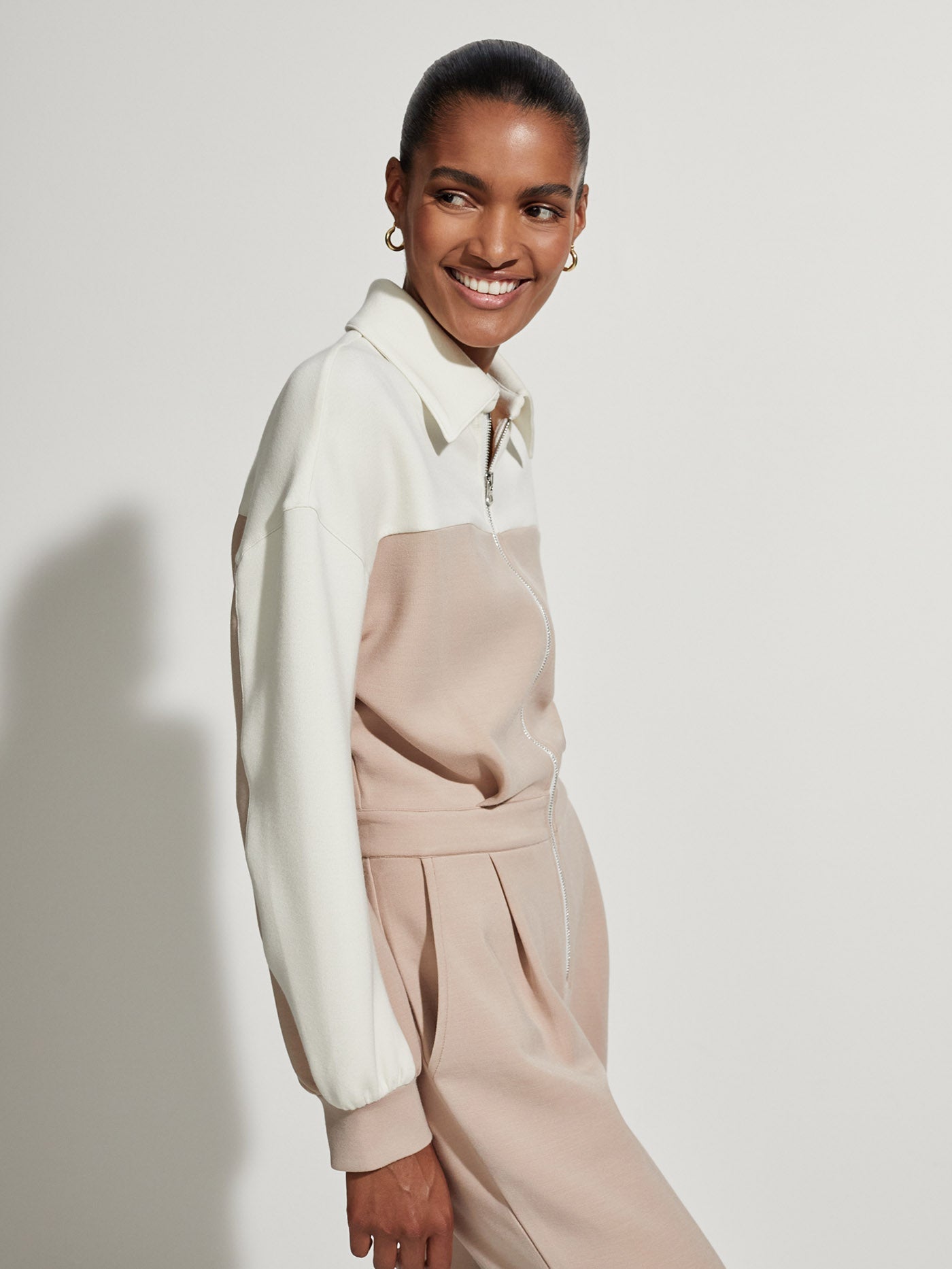 Studio model is 5'9.5", with a 33" bust, 23" waist, 34" hips, and wears a size small.