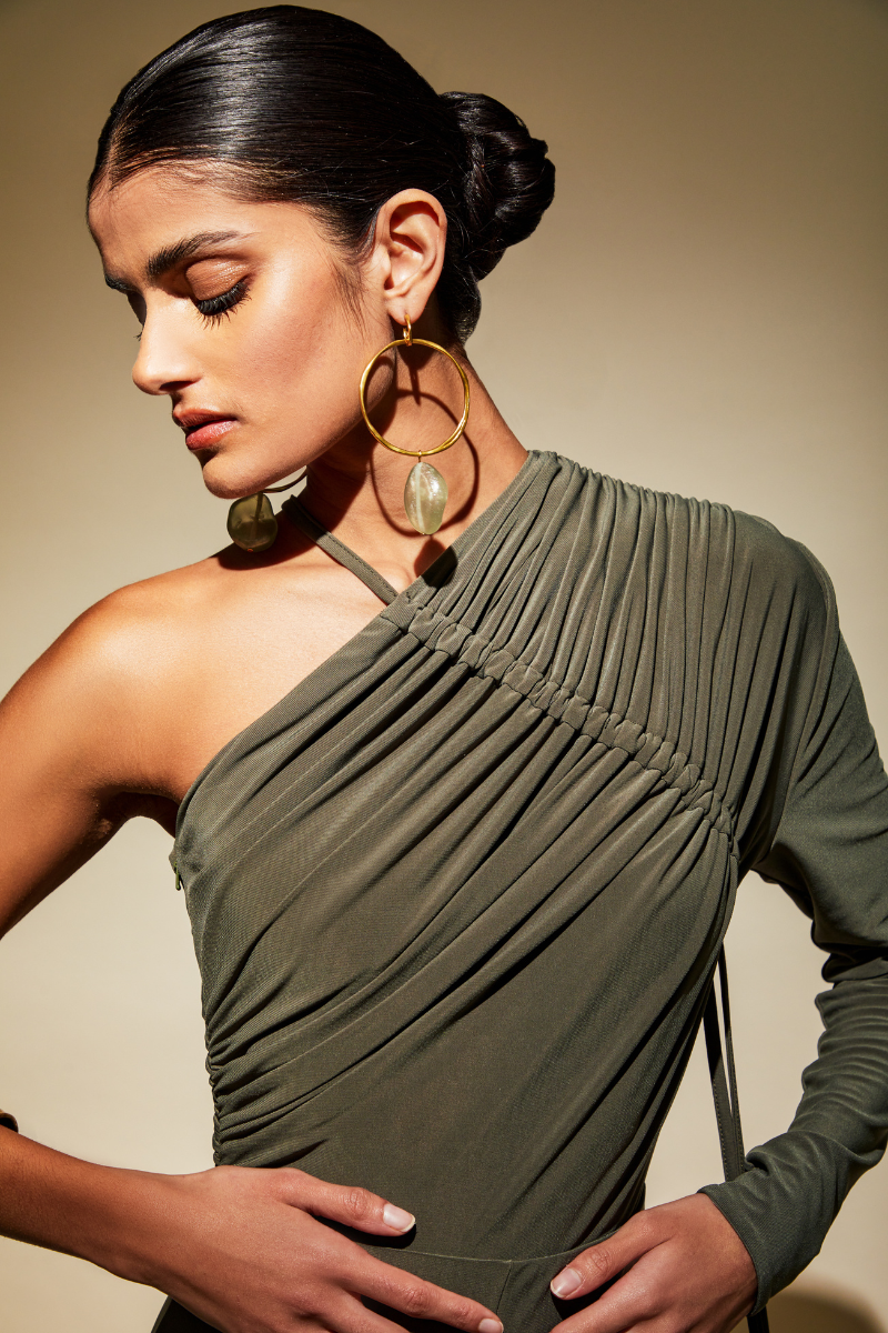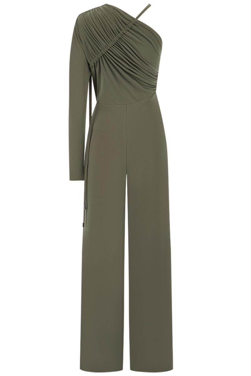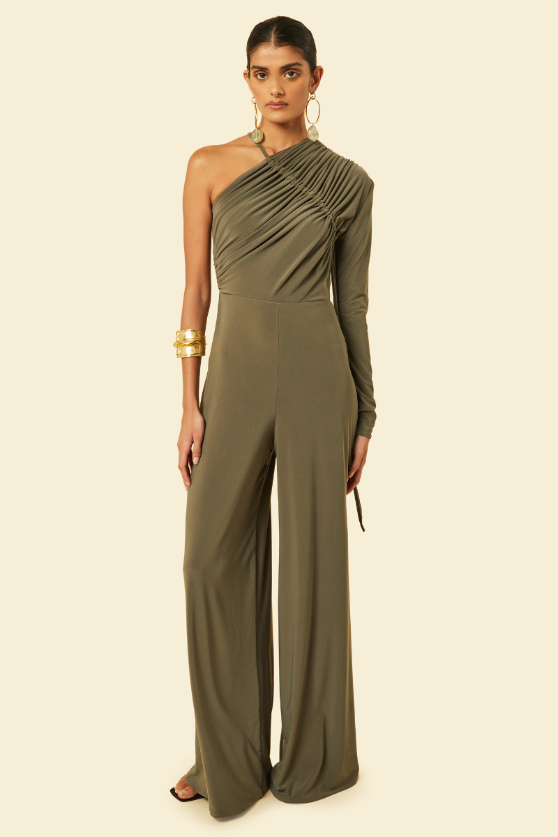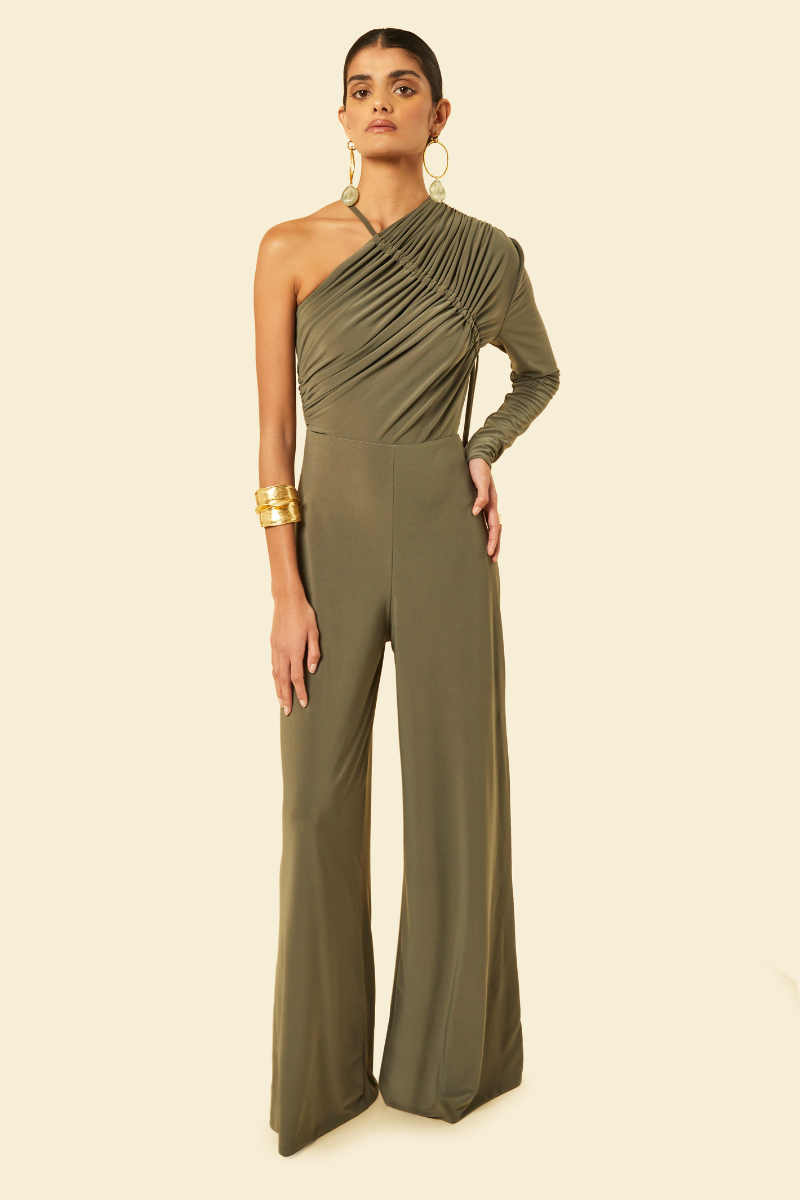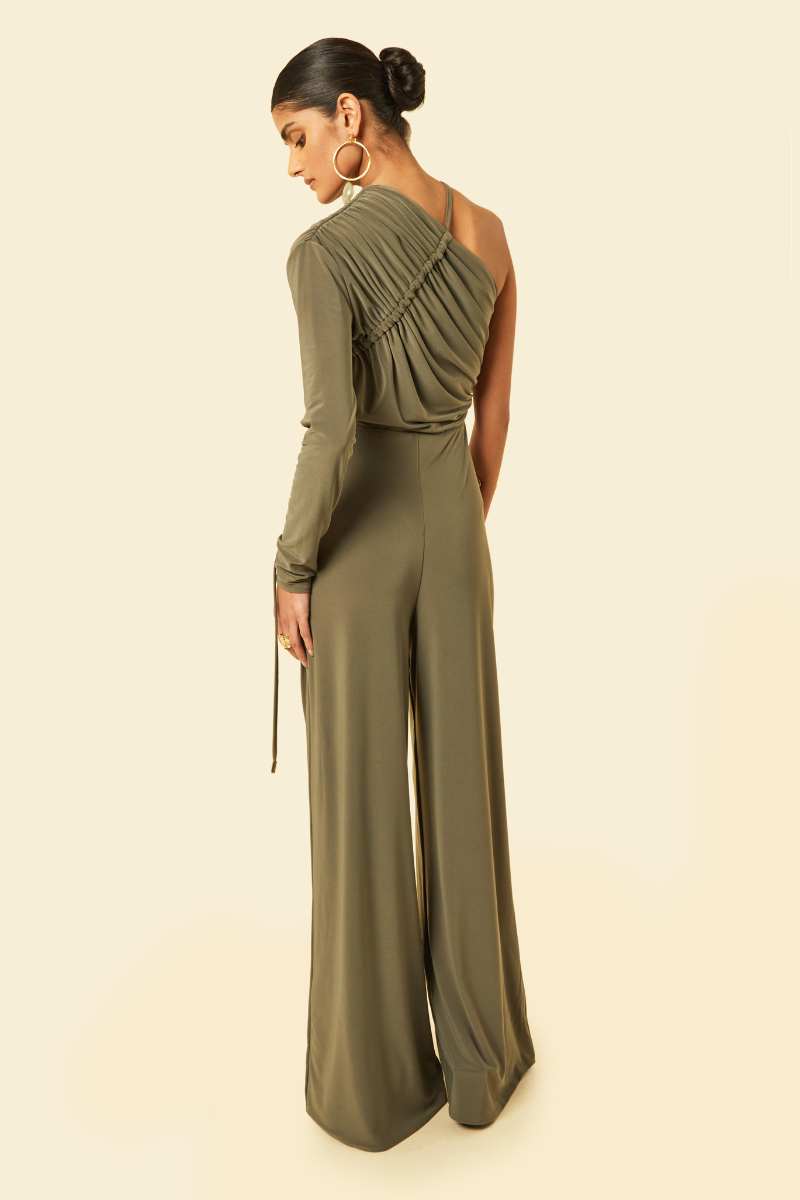 The Ivy Jumpsuit exudes powerful femininity with a one shoulder design, exaggerated ruching detail to the bodice and finished with a wide leg trouser, creating a piece that defines modernism.