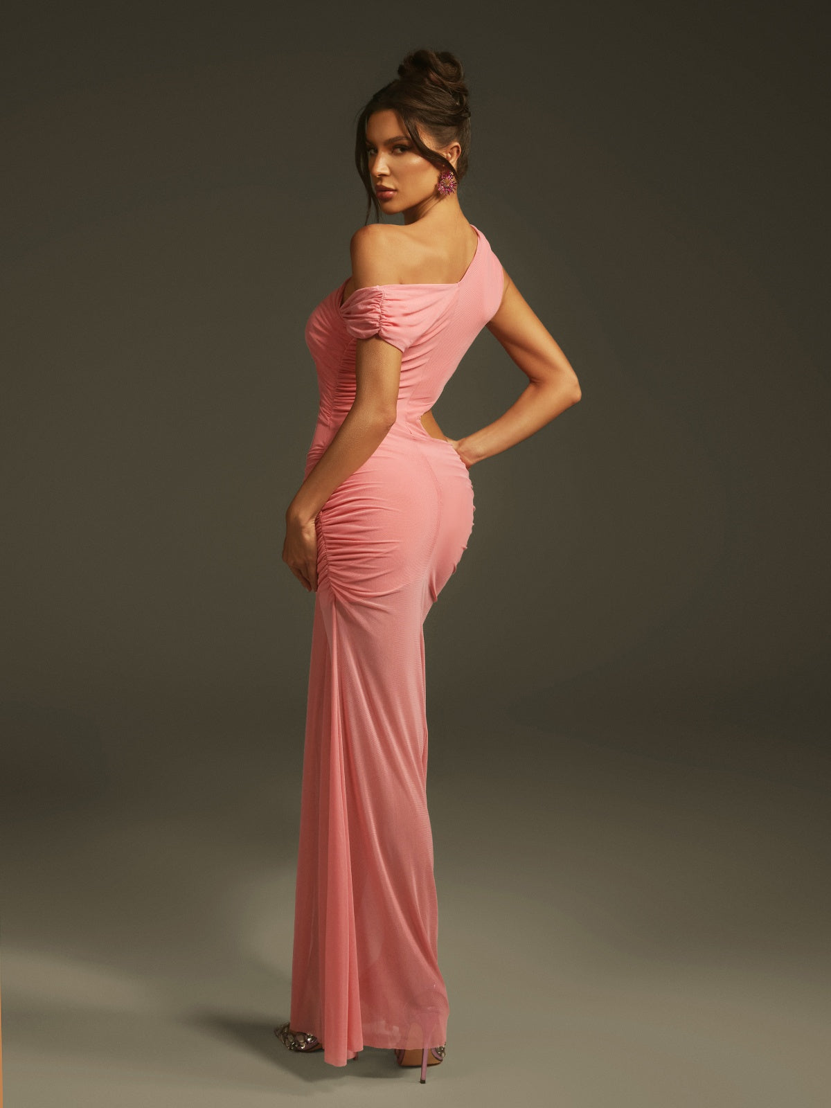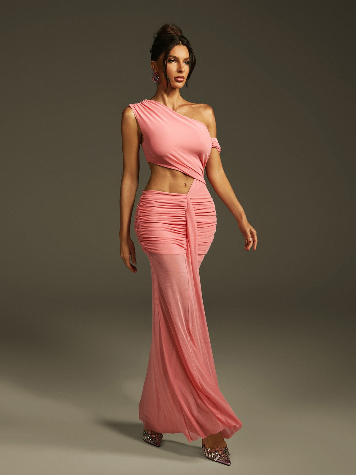 Elevate your evening look with the Lakia Cutout Ruched Mesh Maxi Dress. Featuring elegant ruched detailing and daring cutouts, this dress contours your silhouette while the sheer mesh fabric adds a touch of allure. Perfect for special occasions, it combines sophistication with a modern edge to ensure you stand out effortlessly.