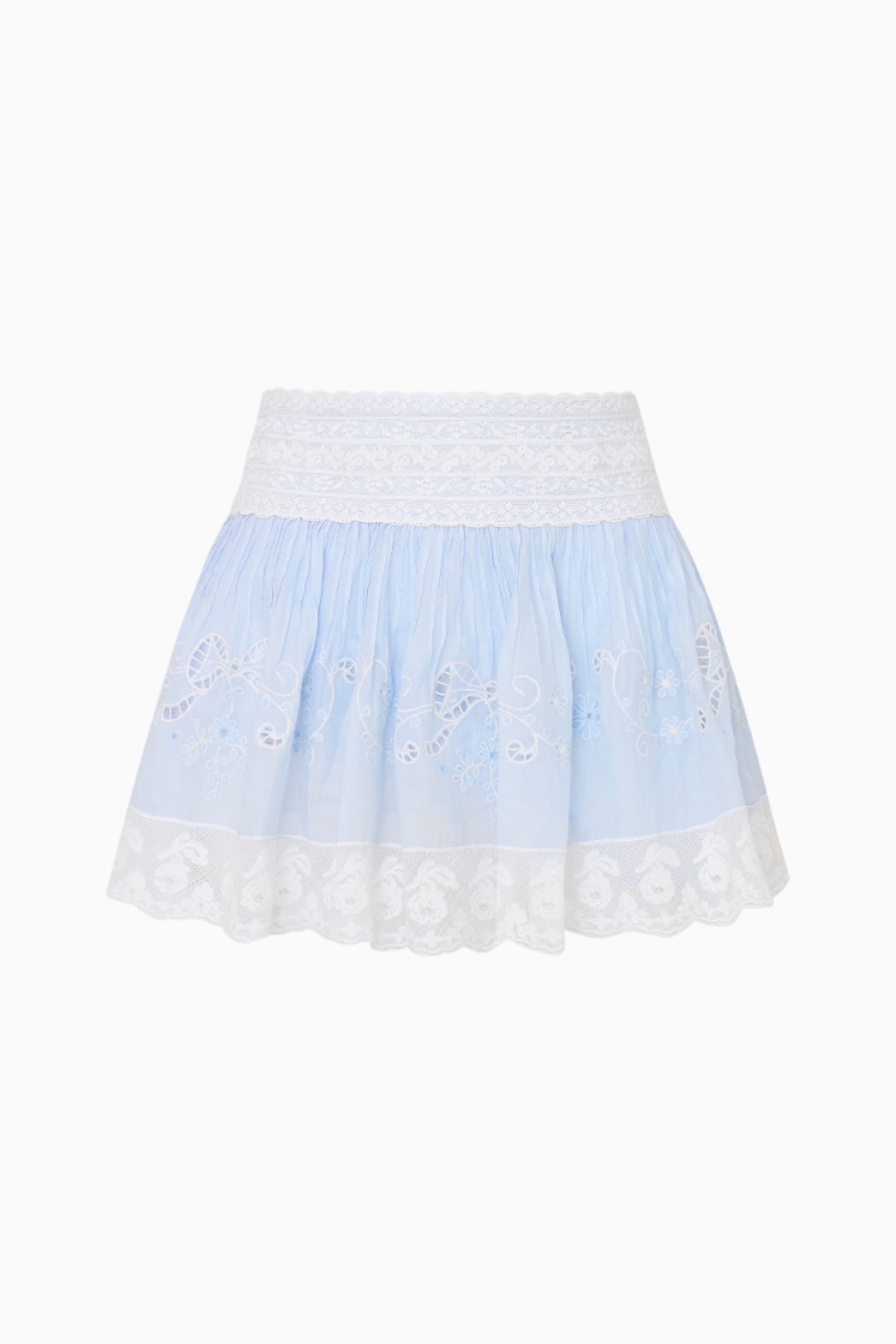 Loving on the Levant Skirt. This airy skirt arrives in an ultra-thin, lightweight cotton voile fabric that’s crisp, but delicate for the high summer season. With a fixed waist, the waist yoke features an arrangement of stacked laces and shirring. The hem stuns with dancing floral embroideries. Pair with the Pruitt Top for a full set.
