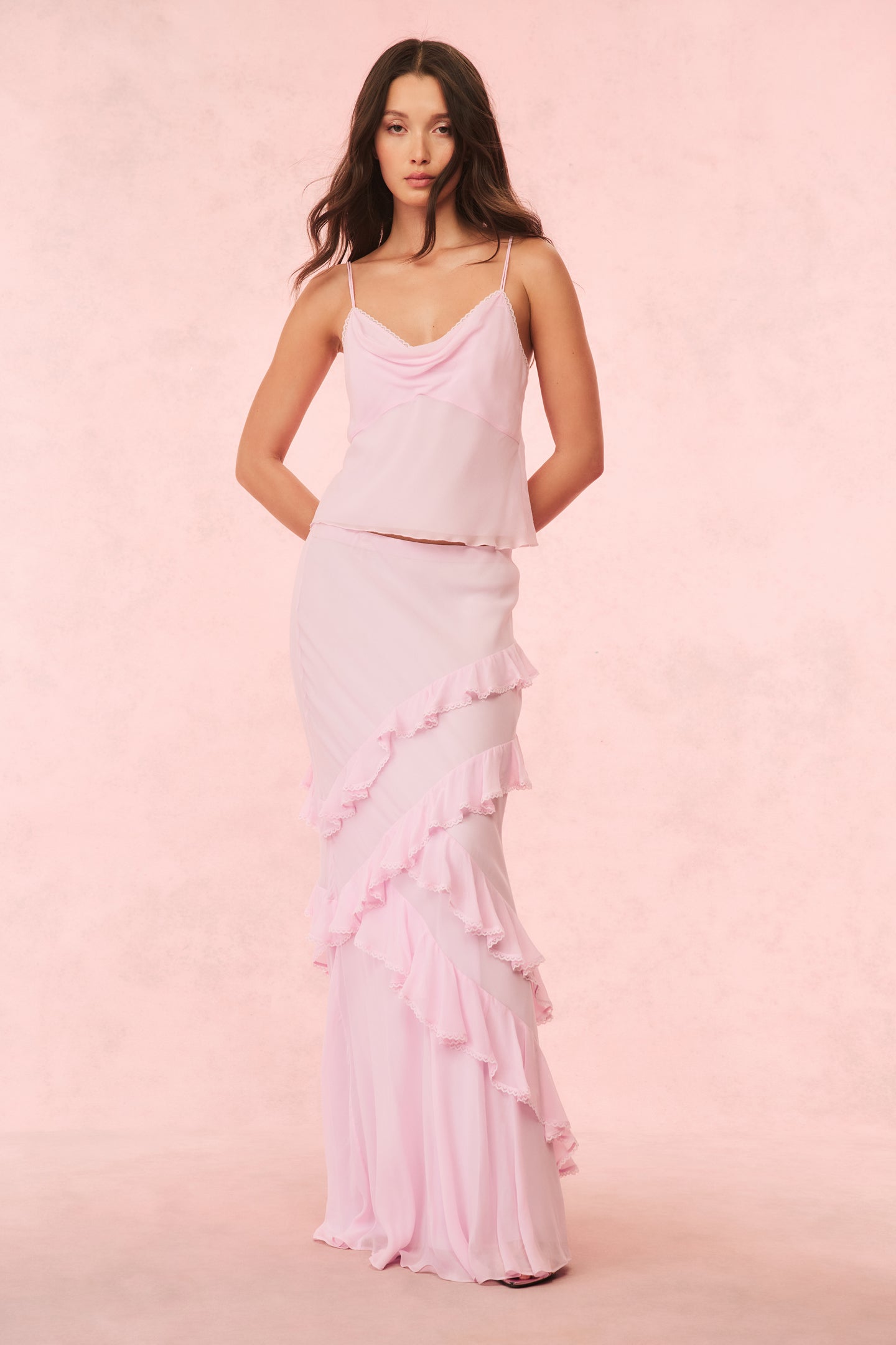 Introducing the Mitnessa Skirt. We turned our best-selling Rialto Dress into the perfect flirty maxi skirt. Arriving with an elevated chiffon fabric, this piece features lovely cascading ruffles from top to bottom with lace-adorned edges for a vintage-inspired look. The waistband is elasticated making it easy to pull on. Pair with the Lavoir Top for a full set.