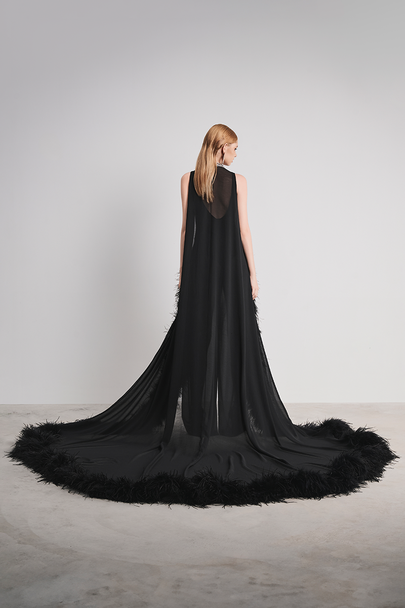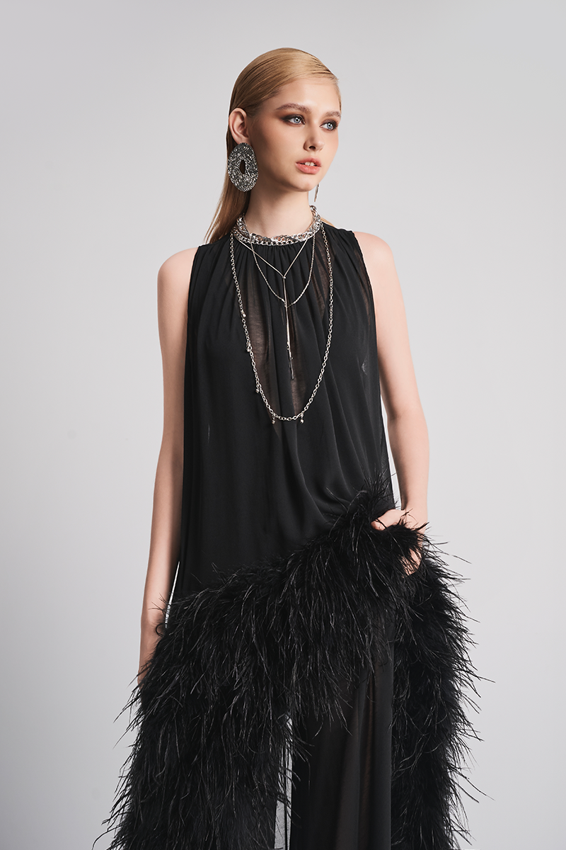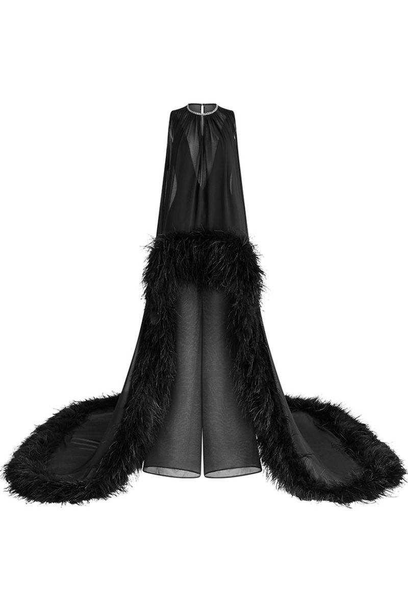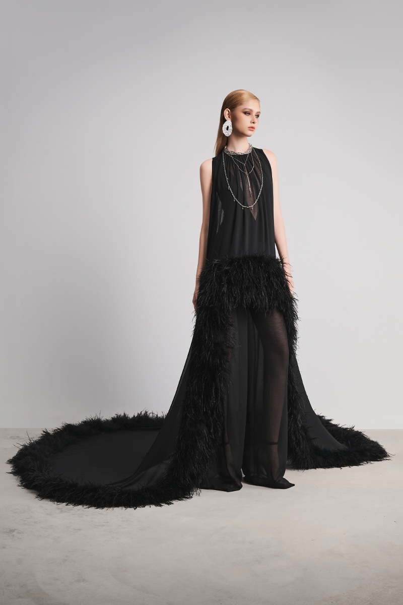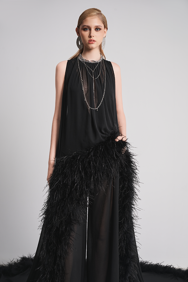 The impressive outfit is created through the skillful combination of various items. The pairing of a bodysuit with long pants made from soft chiffon accentuates the wearer's alluring and feminine beauty. The addition of a long mullet top adorned with trendy feather details completes the ensemble, making it captivating and striking.-