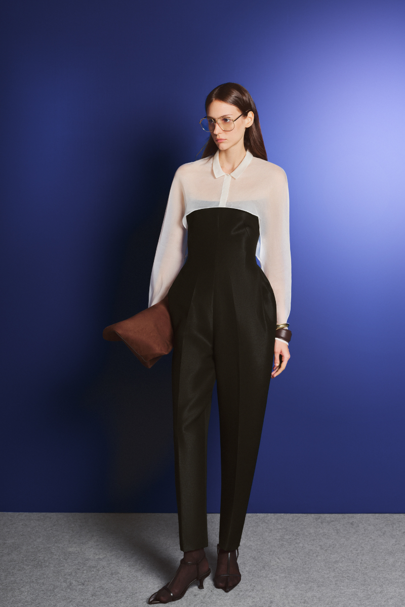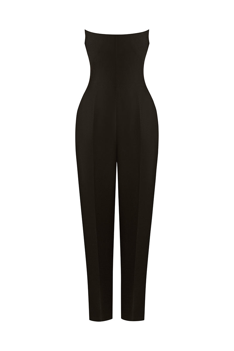 The strapless jumpsuit pairs a crescent neckline with straight-leg pants, balancing allure with elegance. Front pleats add subtle volume at the hips, enhancing the silhouette with a touch of refined dimension.