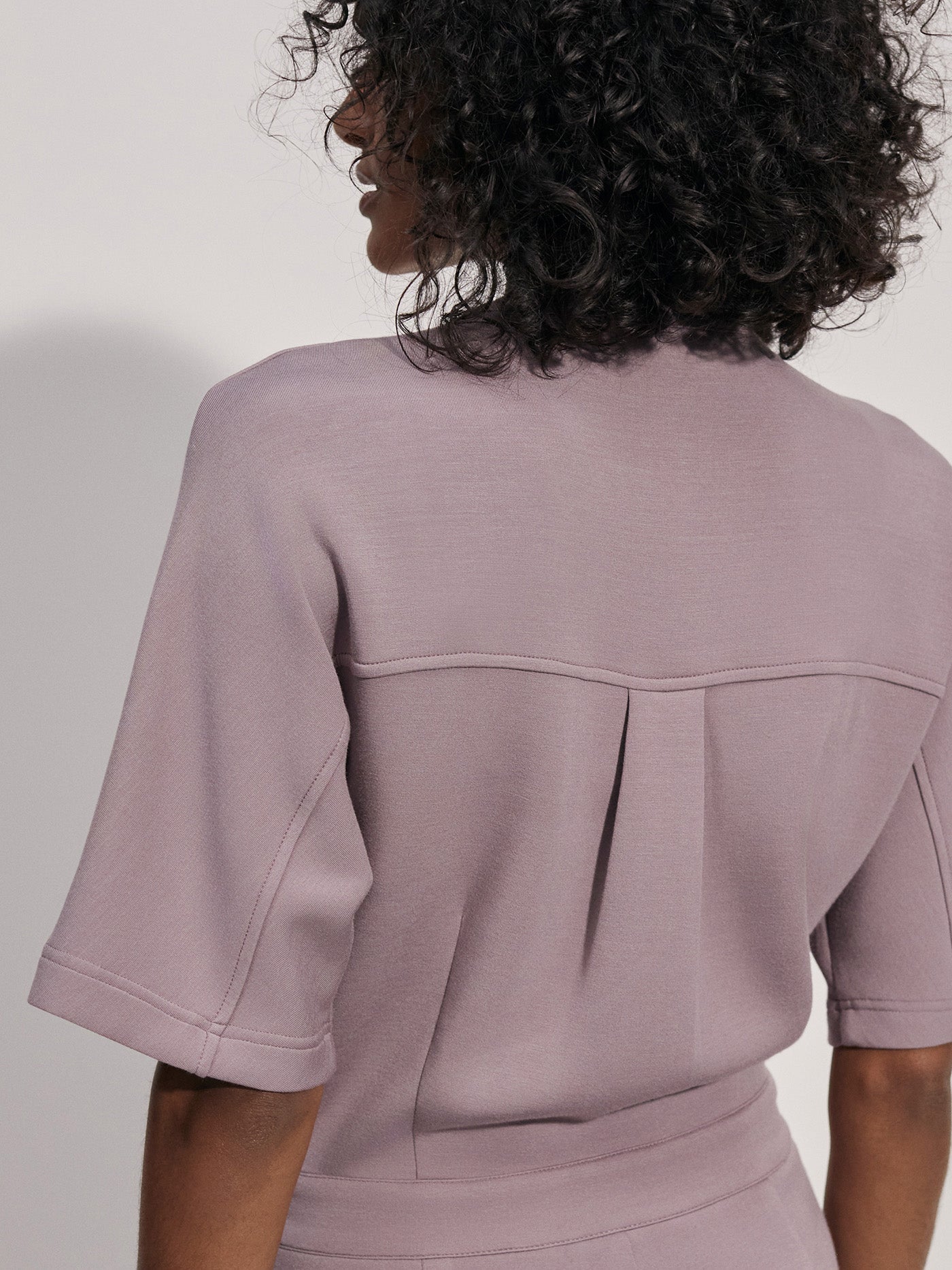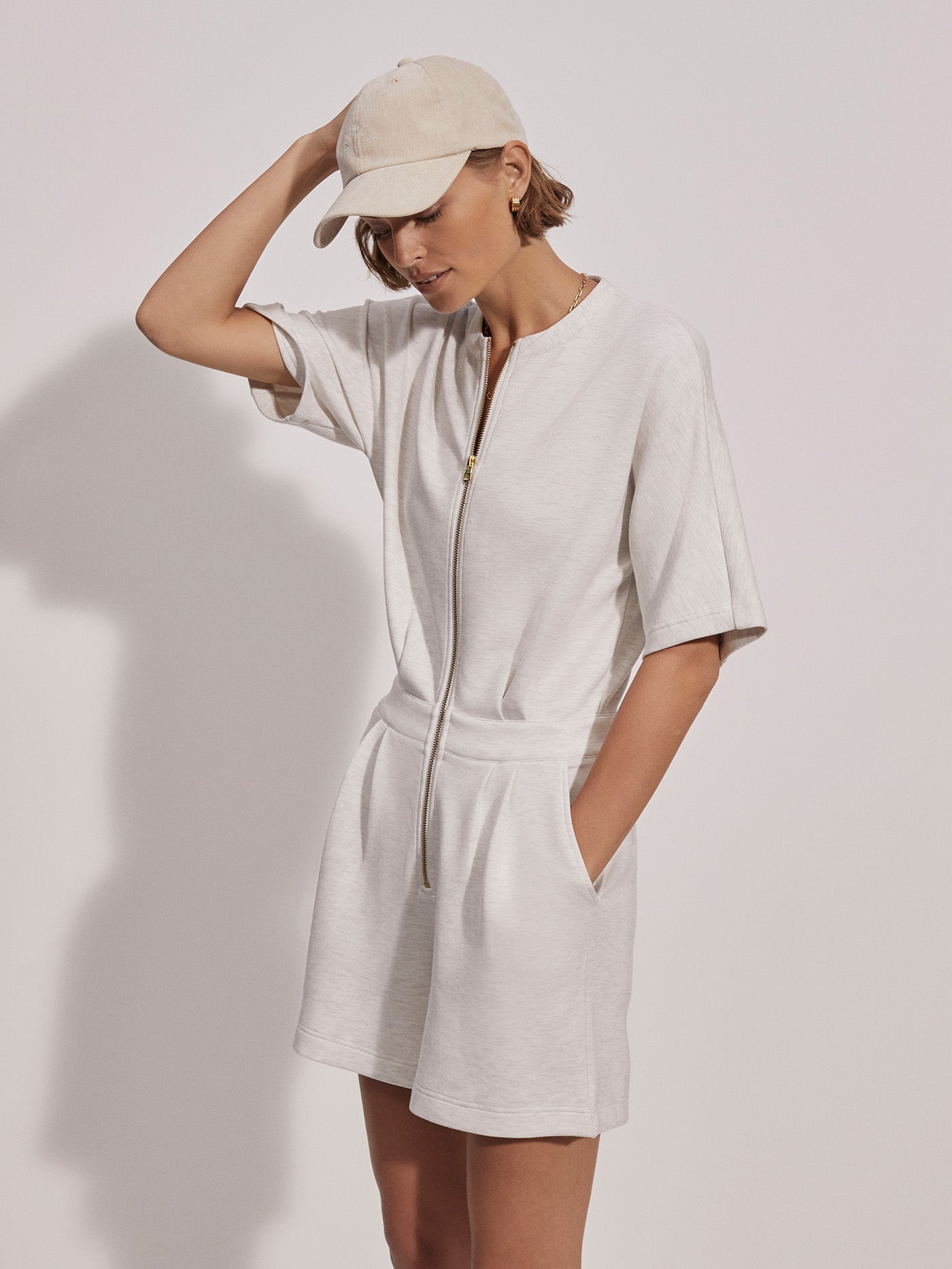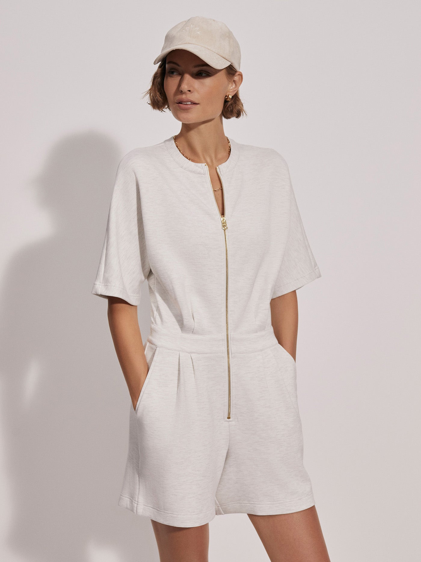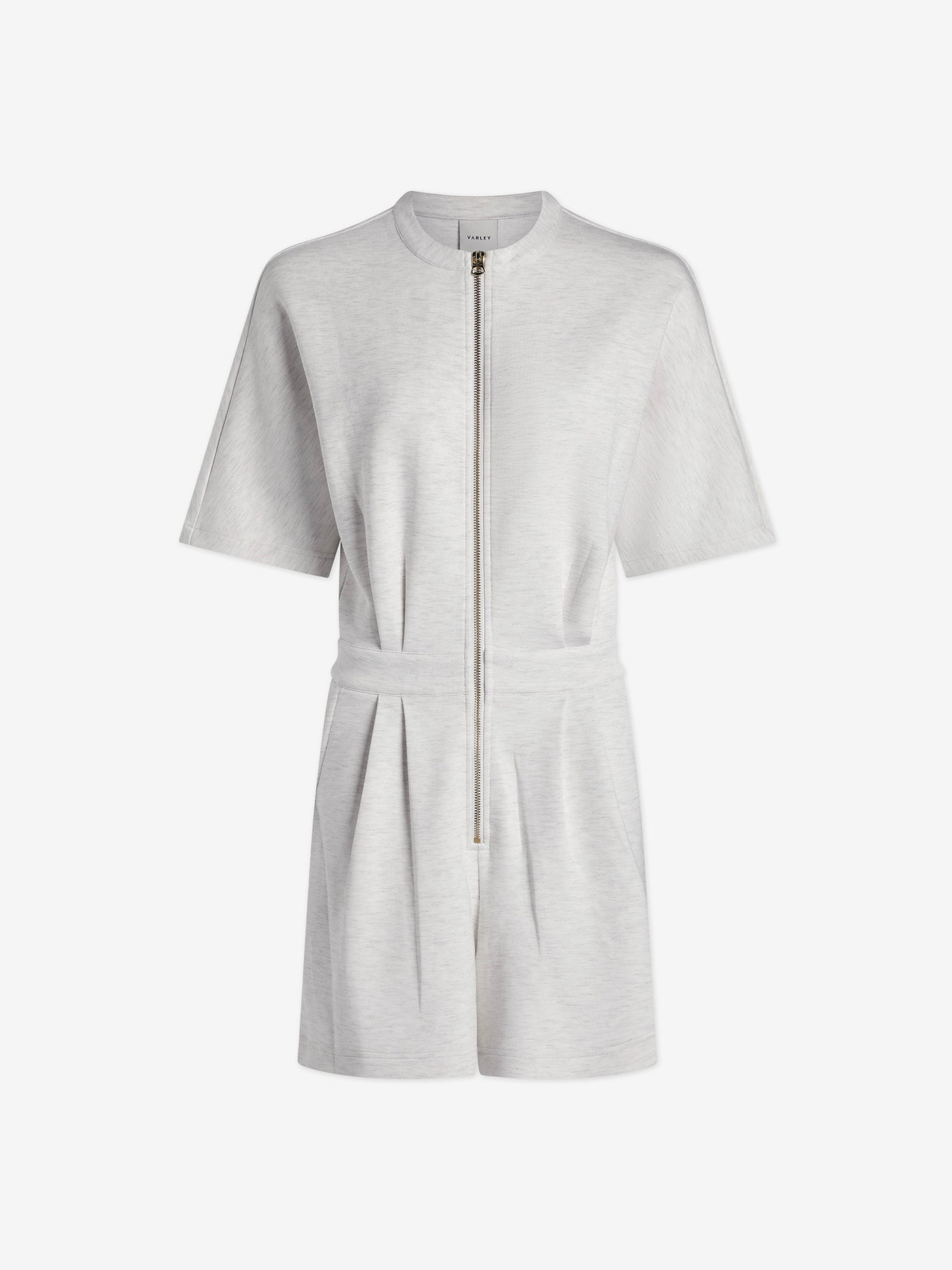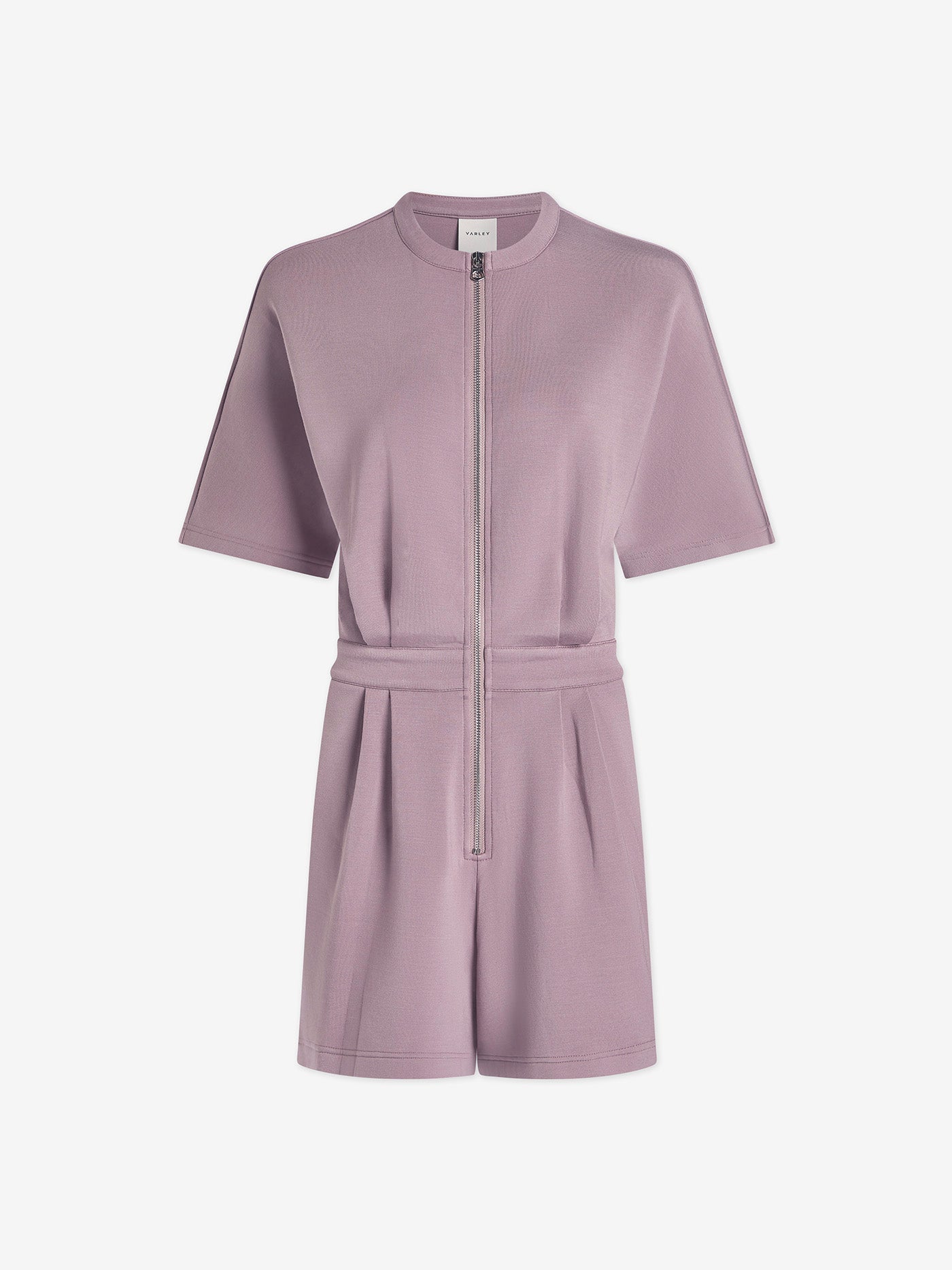The Orlando all-in-one features a zip-front and a flattering waistband detail. Its short sleeves and crew neck offer a relaxed, yet refined look, perfectly complemented by the waist pleats and convenient side pockets.