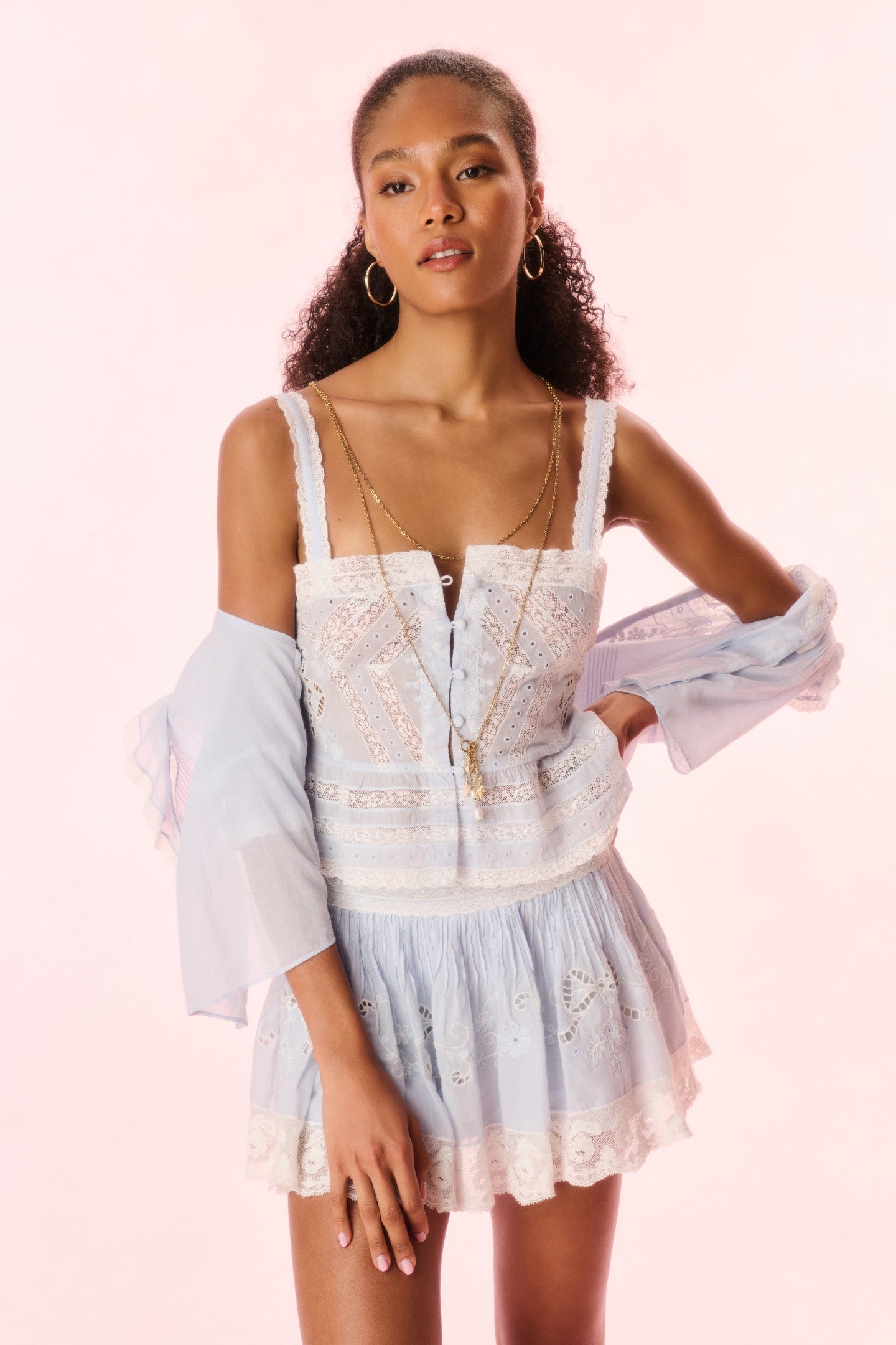 Introducing the Pruitt Top. This pretty cami is designed using an ultra-thin, lightweight cotton voile fabric that’s crisp, but delicate for the high summer season. The easy top has a straight fit with lace straps, a loop-and-button closure at the center front, a diamond arrangement of laces with delicate floral embroidery at the front, and smocking at the back. Pair with the Levant Skirt for a full set.