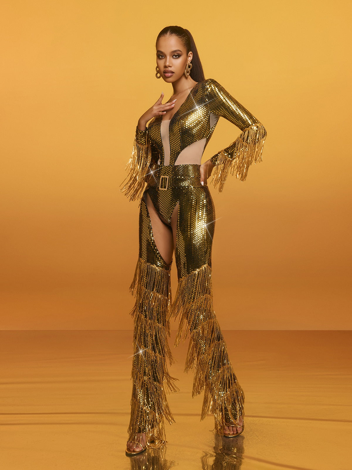 Step into the spotlight with the Relena Cutout Sequin Fringe Jumpsuit. Featuring dazzling sequins and stylish cutouts, this jumpsuit combines bold glamour with modern design. The fringe detailing adds dynamic movement, making it perfect for parties or nights when you want to make a memorable impression. Elevate your look with this statement piece that exudes confidence and flair.