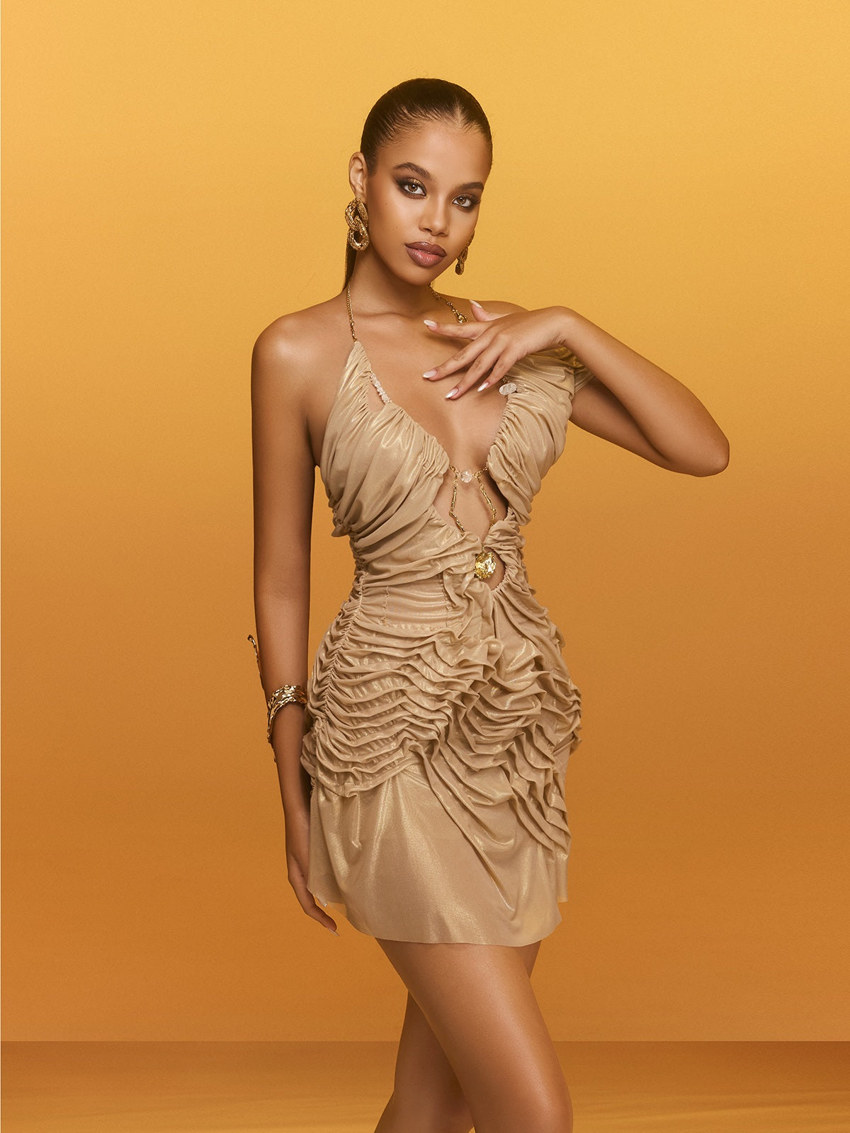 Make a bold statement with the Reut Halterneck Ruched Mini Dress. Its ruched detailing enhances your silhouette, while the halterneck style adds a touch of sophistication. Perfect for nights out or special events, this mini dress combines style and confidence to help you turn heads wherever you go.