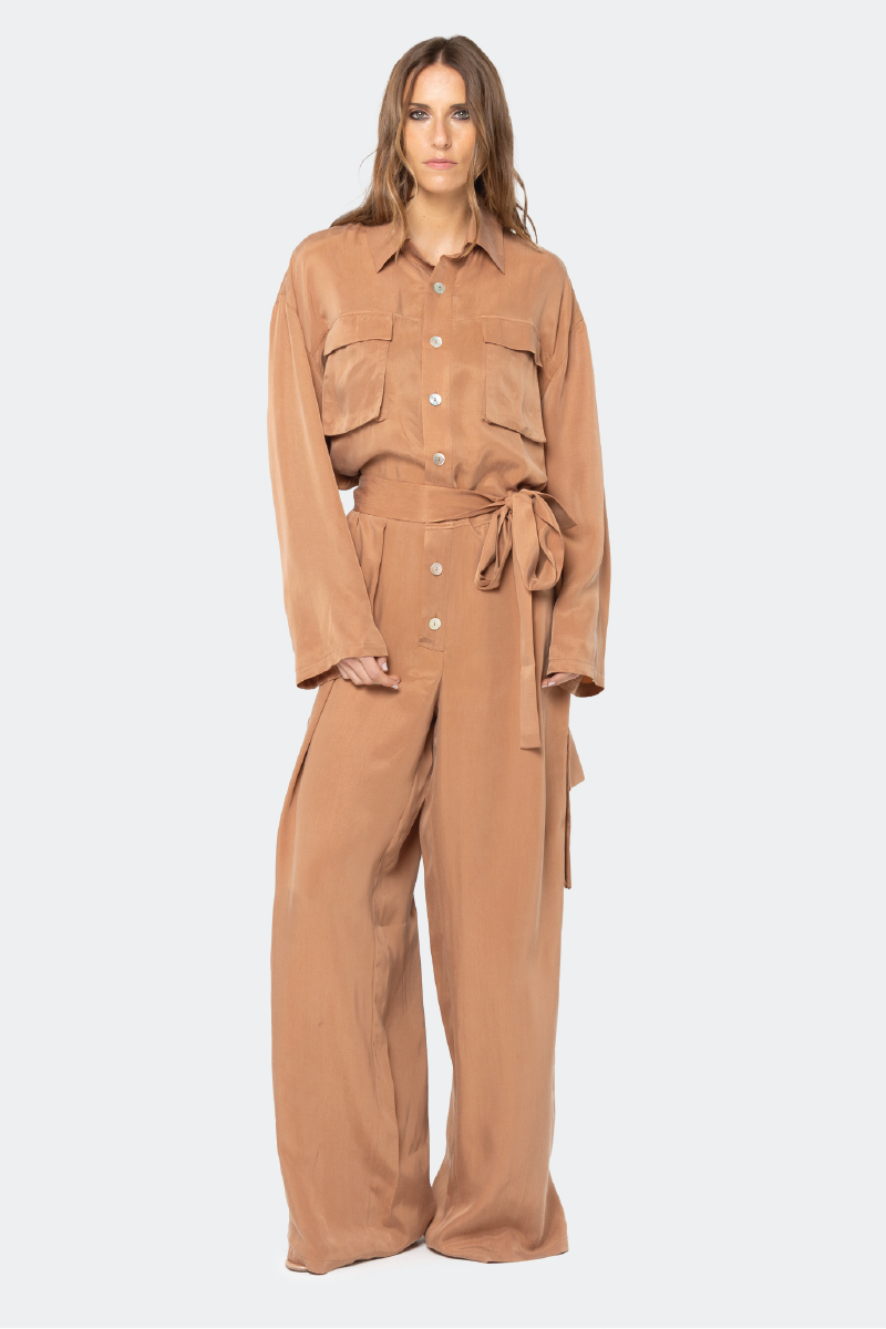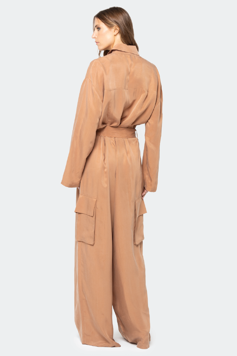 Elevate your style with this oversized jumpsuit featuring a loose fit, large pockets, and a detachable sash.