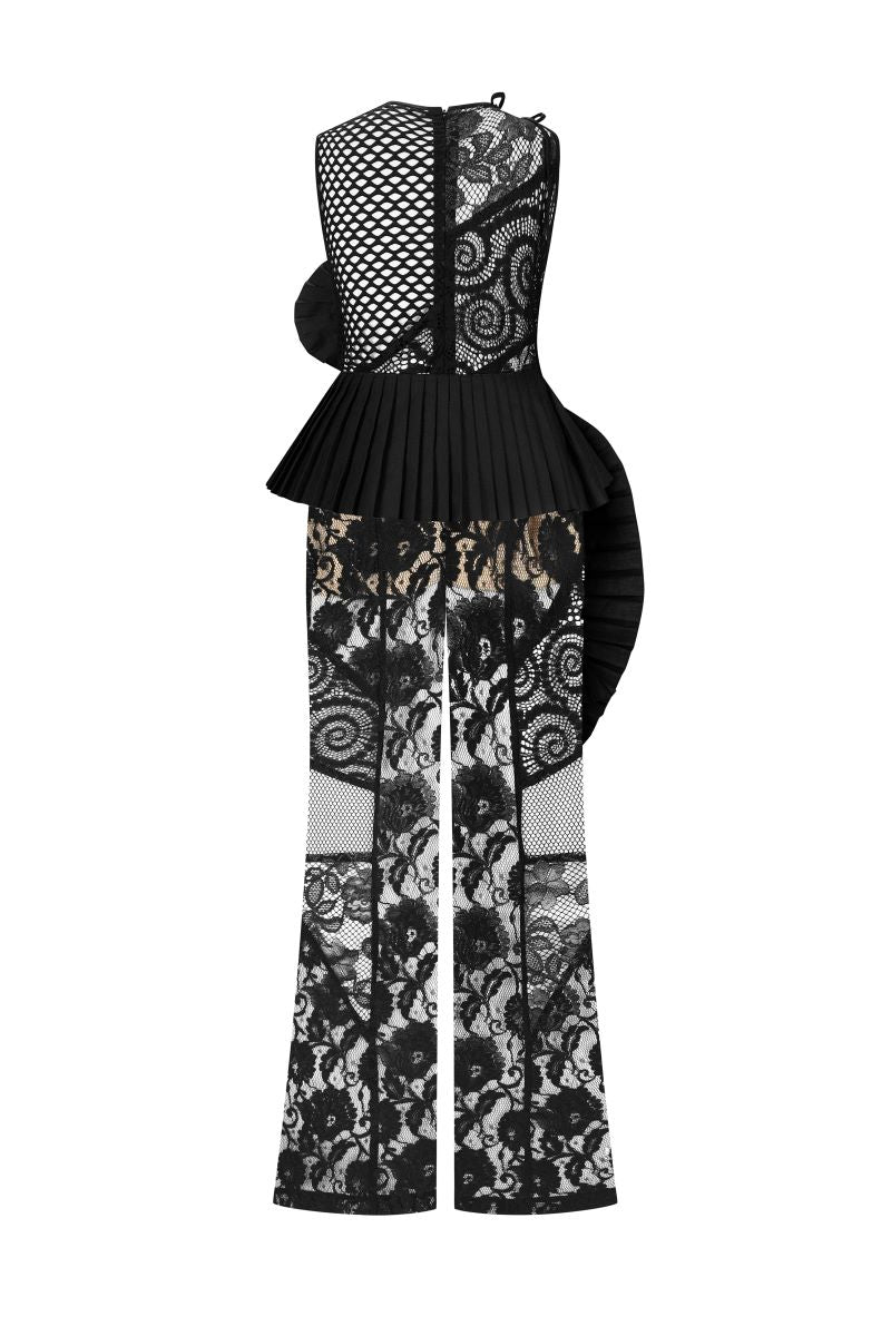 SLEEVELESS LACE MESH FLARED JUMPSUIT