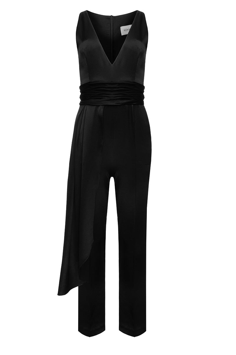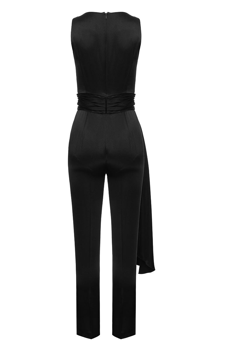 Black satin sleeveless jumpsuit. Features v-neck and a long waist tie. Zipper fastening in the back.